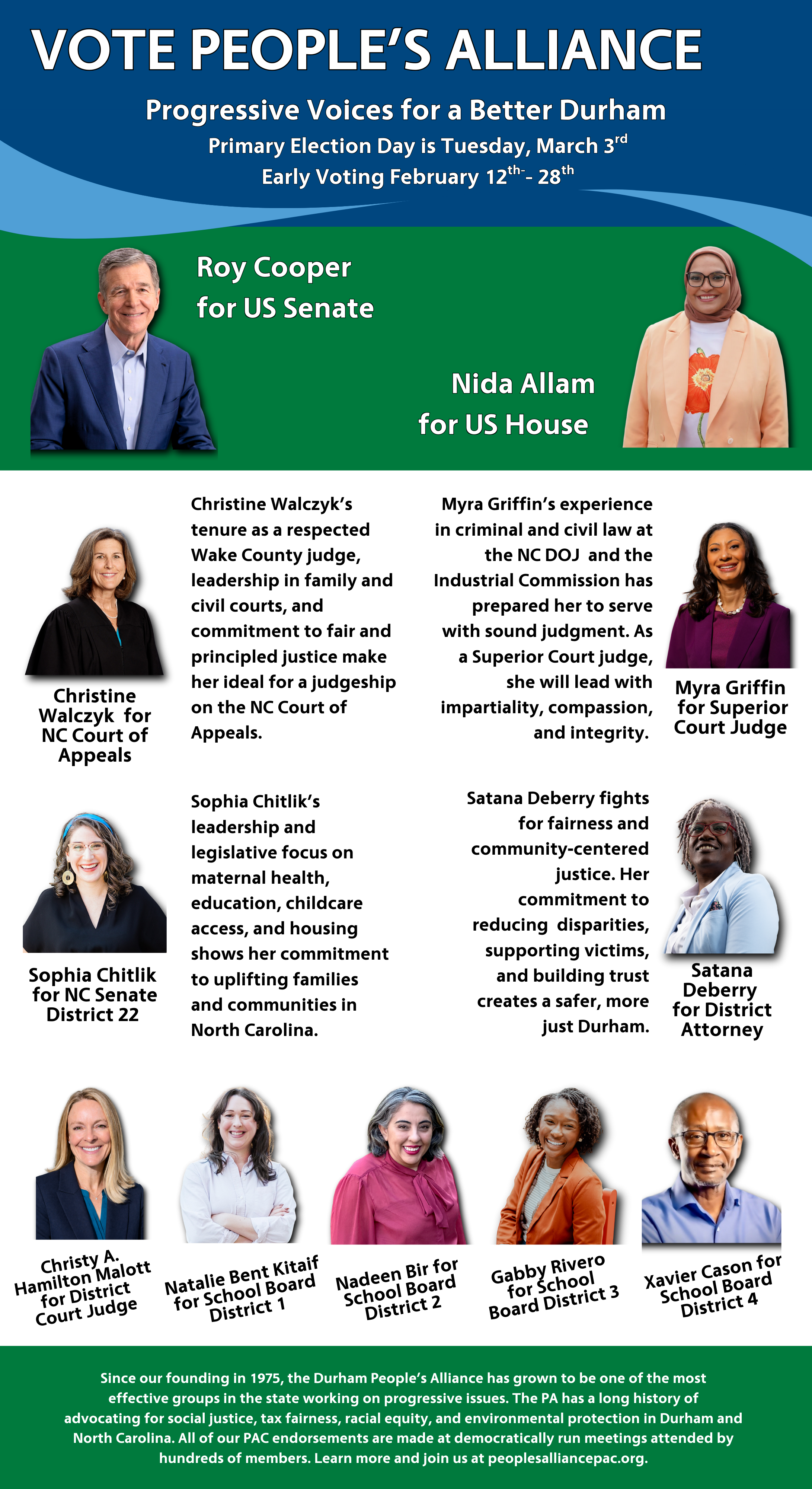 PA PAC Endorsement Meeting Held Virtually - Over 580 members meet to decide - Nida Allam endorsed for U.S. House of Representatives, Sophia Chitlik endorsed for NC Senate District 22, Christine Walczyk endorsed for NC Court of Appeals Seat 03, Myra Griffin endorsed for Superior Court Judge District 16B 02, No Endorsement for District Court District Judge 16B Seat 02, Christy Hamilton Malott for NC District Court Judge District 16B Seat 05, Satana Deberry for Durham County District Attorney, Aminah Thompson for Durham County Clerk of Superior Court, Clarence Birkhead for Durham County Sheriff, Natalie Bent Kitaif for Durham County Board of Education District 1, Nadeen Bir for Durham County Board of Education District 2, Gabrielle Rivero for Durham County Board of Education District 3, and Xavier Cason for Durham County Board of Education District 4.