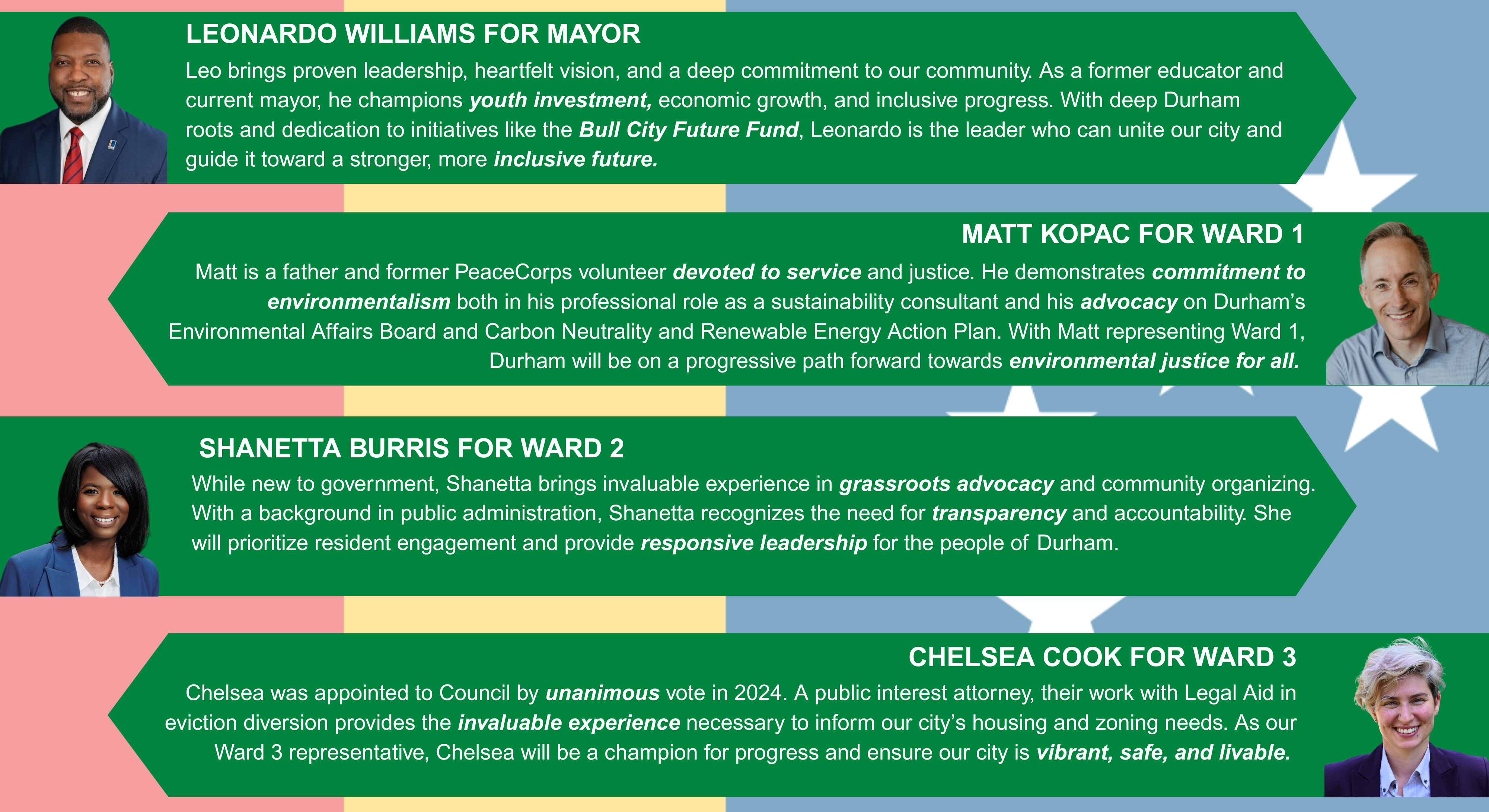 These progressive candidates are the most qualified and best prepared to serve the people of Durham. PA PAC is dedicated to helping them win.